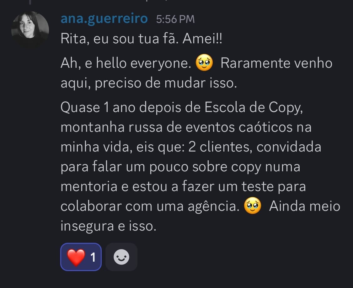 Já tinha feito alguns cursos e imersões de copywriting, mas sempre estive um pouco travado ou reticente a escrever porque venho da área de informática, mas com o sonho de um dia poder viver de copy.